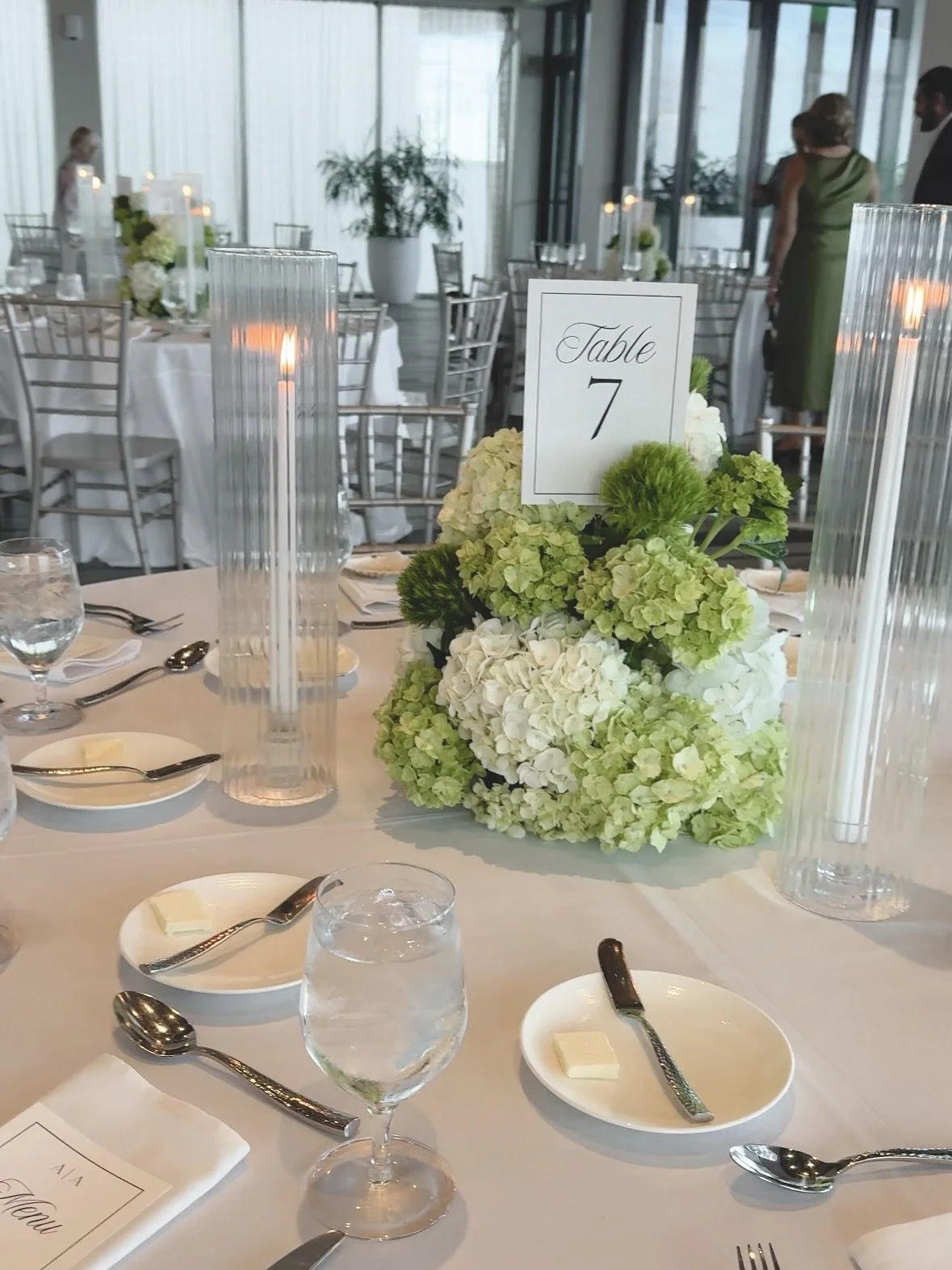 For the reception, the centerpieces featured tall, graceful vases filled with a mix of soft whites, blush pinks, and deep burgundy, including roses, lisianthus, and spray, surrounded by flickering candles and trailing greenery. These were complemented by a series of petite bud vases scattered across the tables, each holding smaller arrangements for a natural, aromatic touch. The combination of the floral elements—soft petals, rich tones, and organic textures—created a wintery yet warm atmosphere, evoking the quiet beauty of the season while maintaining an air of understated sophistication.