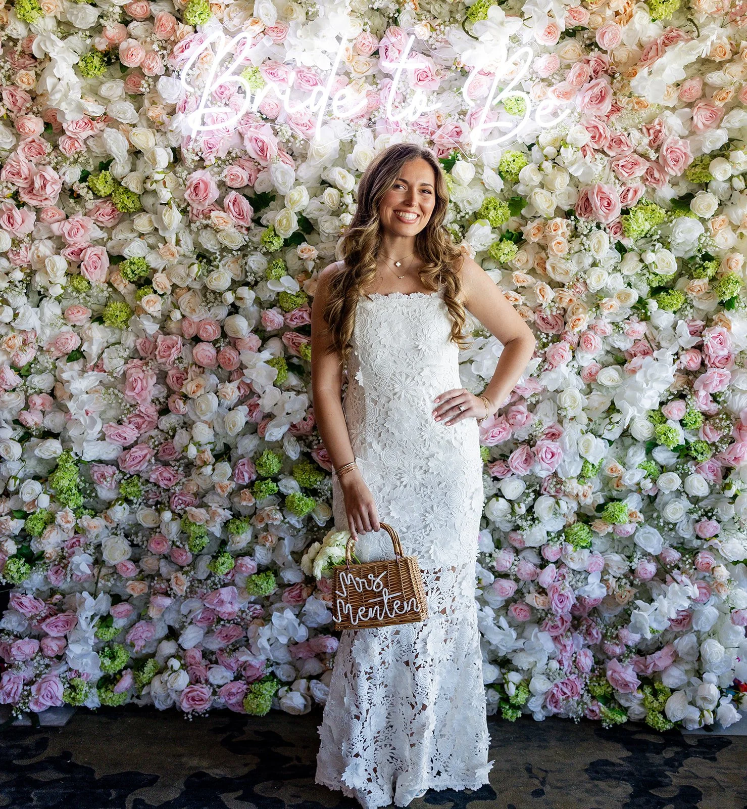 Guests were greeted by a full floral market moment perfect for selfies and bouquet-building and sipped bubbly surrounded by garden-style arrangements and teacup bud vases. A custom floral wall and “Bride to Be” neon sign made for the dreamiest photo backdrop provided by @Janettloveshop.