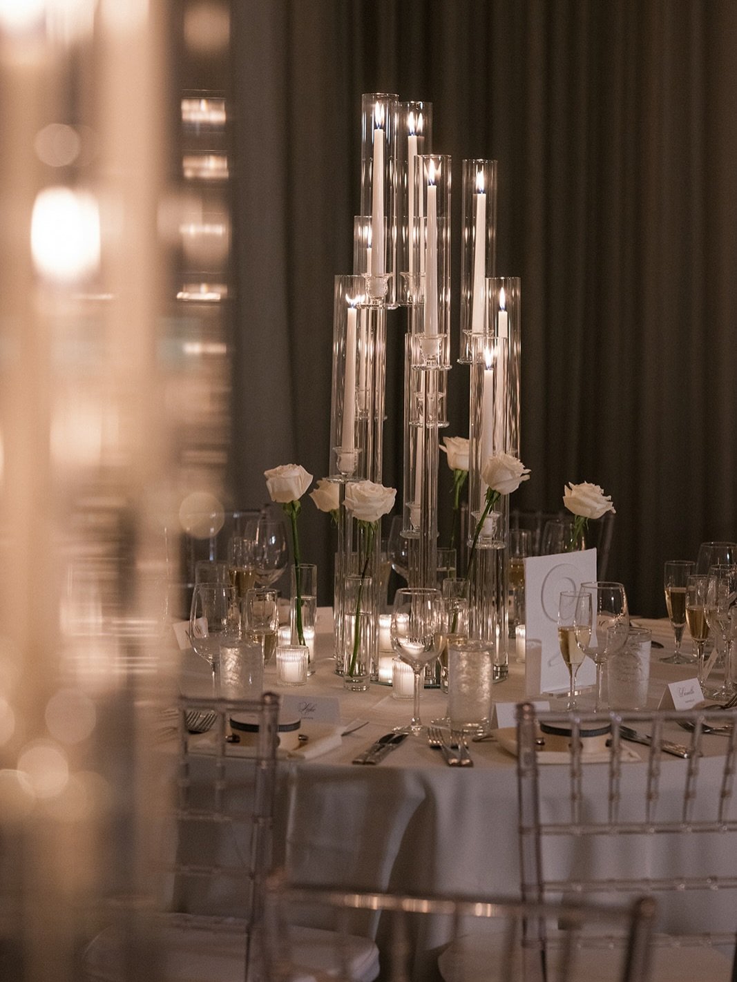 For the reception, the centerpieces featured tall, graceful vases filled with a mix of soft whites, blush pinks, and deep burgundy, including roses, lisianthus, and spray, surrounded by flickering candles and trailing greenery. These were complemented by a series of petite bud vases scattered across the tables, each holding smaller arrangements for a natural, aromatic touch. The combination of the floral elements—soft petals, rich tones, and organic textures—created a wintery yet warm atmosphere, evoking the quiet beauty of the season while maintaining an air of understated sophistication.